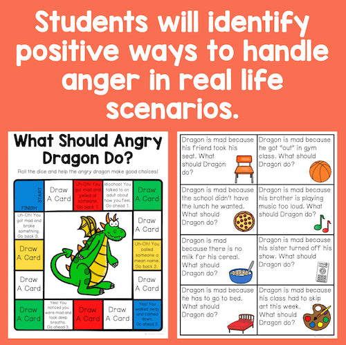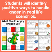 "What Should Angry Dragon Do?" Board Game: Kids will make their way around the game board as they identify positive ways to handle anger in real life scenarios. Includes a game board and 24 question cards