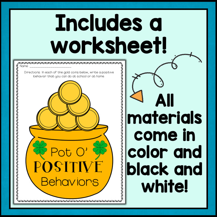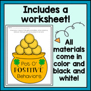 Use these fun, St. Patrick’s Day themed activities to help your students learn and practice positive behavior. Students will look at 20 behaviors and decide whether they belong in the "Pot O' Positive Behaviors" or the "Pot O' Negative Behaviors." Students will then have a chance to earn "coins" for their positive behavior to put in their own "Pot O' Positive Behavior!"